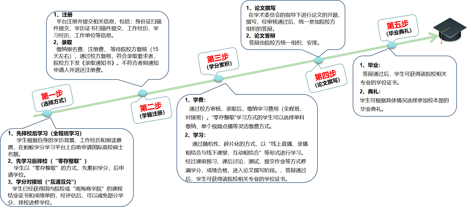 學生以“零存整取”的方式,先累積學分,后申請學位。學生根據自身的實際情況,在“南海學分”上先行注冊,通過隨機性、碎片化的方式進行學習,單個學科的累積錄播視頻學習超過20小時,按照要求完成作業(yè),經過教授指導并通過評估;即可獲得單科的學分證明,按照院校要求,累積完成所有課程的學習且成績合格者可獲得“南海商學院頒發(fā)的研修證書,可申請平臺推薦國際院校學位,進行論文的輔導與撰寫,符合要求、通過答辯,可獲得該院校相關專業(yè)的學位證書。
